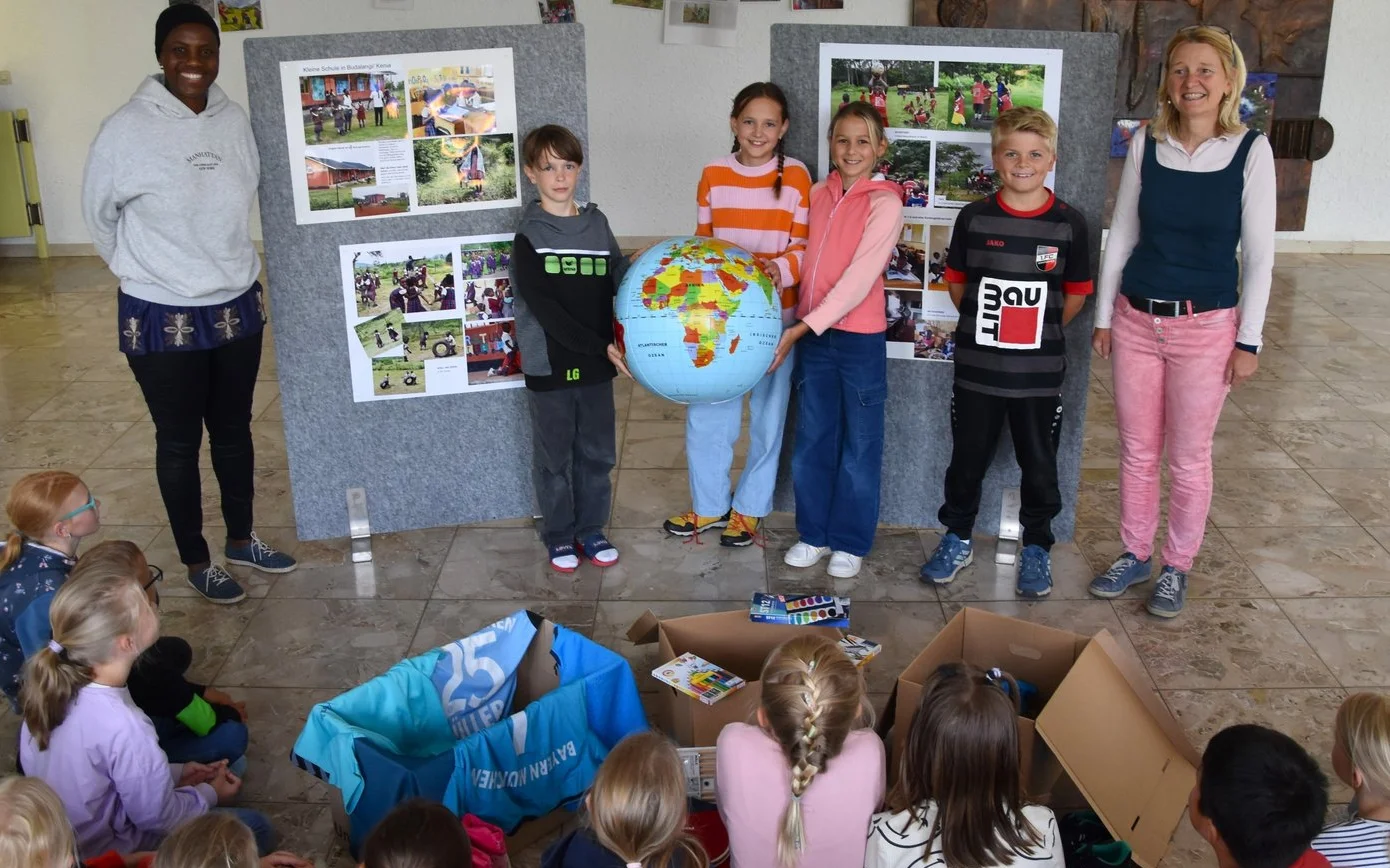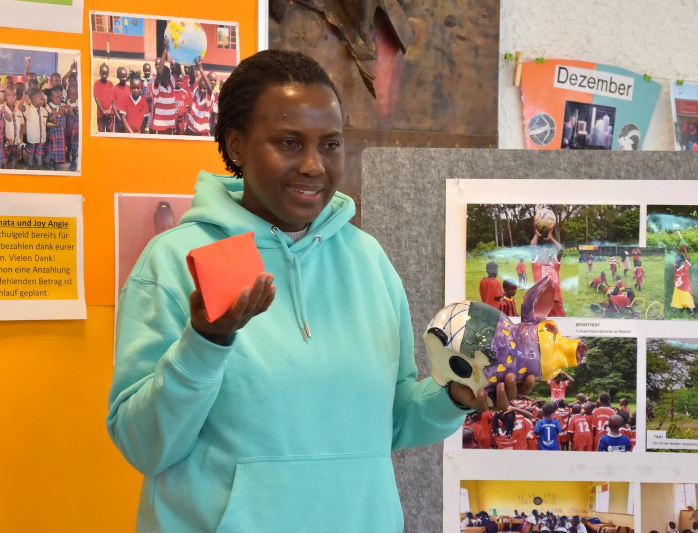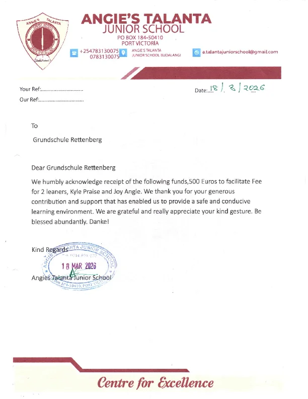 Nachdem bekannt wurde, dass zwei Kinder in unserer Partnerschule in Kenia nicht mehr in die Schule gehen können, da die Mutter gestorben ist und niemand mehr das Schulgeld für sie bezahlen kann, haben wir in unserer Schule eine Spendenaktion ins Leben gerufen. Wenn jedes Kind 1 € spendet, schaffen wir es die Schule für ein Kind für ein Jahr zu bezahlen, bei 2 € können beide Kinder 2026 in die Schule gehen. Bereits drei Tage später hatten wir die 500 € zusammen und konnten diese nun Angela H. im Rahmen einer Schulversammlung übergeben, die den Betrag direkt an die Schule dort überweist. So können nun Kyle und Joy weiterhin die Schule in Budalangi besuchen. Da nicht nur Kinder, sondern auch Eltern, Großeltern, … mitgespendet haben, haben wir bereits jetzt schon fast auch das nötige Geld für ein Kind für 2027 zusammen.