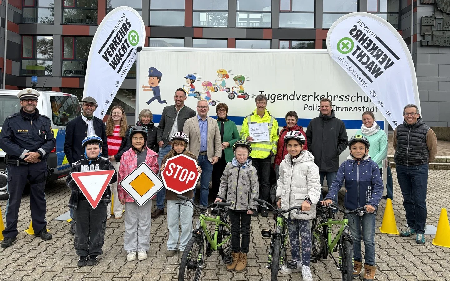 Ende September wurde der neue Fahrradübungsanhänger vom Vorsitzenden der Verkehrswacht Oberallgäu-Süd, Herrn Schmidt, an die Rektorin der Grundschule, Frau Scherm, übergeben. Nachdem im Lehrplan der Grundschulen vorgesehen ist, dass die Kinder bereits in der zweiten und dritten Klasse im Fahrradfahren unterrichtet werden müssen, stellte dies die Schulen vor erhebliche Probleme. Gerade den Kindern, welche mit dem Bus zur Schule gebracht werden, ist es nicht möglich, das eigene Fahrrad mitzunehmen. Um hier Abhilfe zu schaffen, wurde auf Initiative der Verkehrswacht welche auch die 15 Übungsfahrräder sponsorte, von den sechs Kommunen im Dienstbereich der Polizei Immenstadt ein eigener Anhänger finanziert und mit Übungsmaterial ausgerüstet. Von die ILE Alpsee-Grünten wurde zudem ein Förderbetrag zugesagt. Die einzelnen Grundschulen tragen sich ab jetzt in einen Plan ein und können so den Anhänger für ihren Unterricht nutzen, ohne dass jede Schule einzeln das notwendige Übungsmaterial immer vorrätig halten muss.